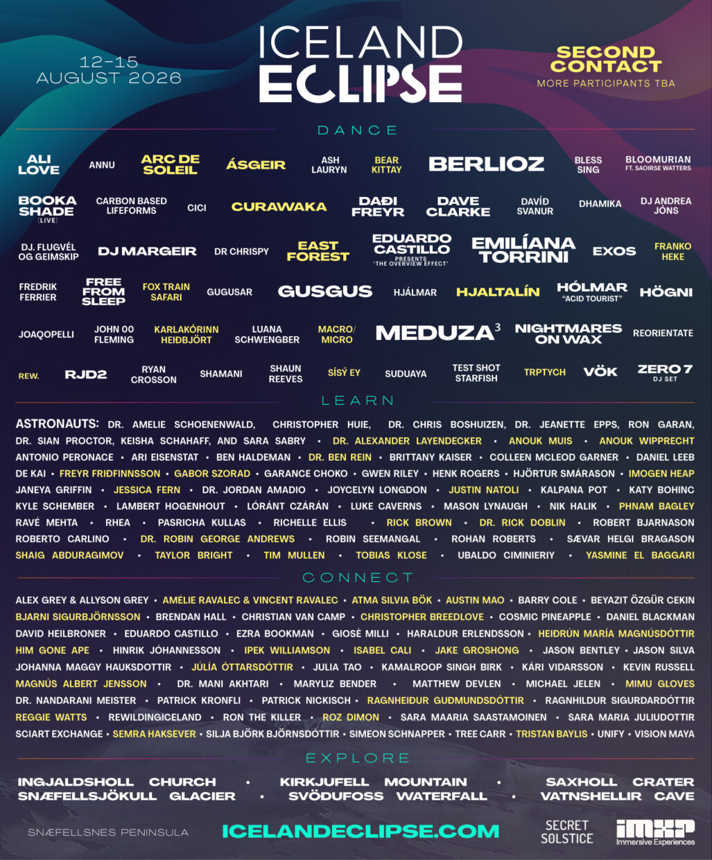 In the lead up to a once in a lifetime festival, Iceland Eclipse unveils the Second Contact lineup with more programming, adding Side Quests and Excursions. Iceland Eclipse will take place August 12-15 2026 in the Snæfellsnes Peninsula. The quickly sold out First Contact announcement revealed performances by artists like Meduza3, Berlioz, and Emilíana Torrini along with programming by participants from Space for Humanity, the UN, NASA, and more. Second Contact continues the trend of bringing out of this world experiences.